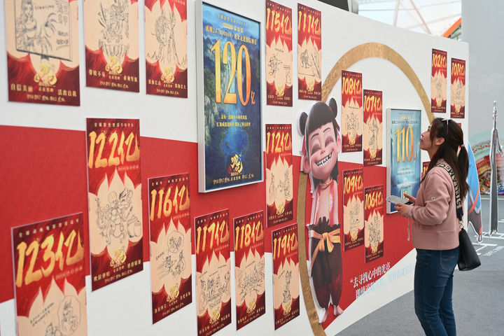 2025年4月19日,觀(guān)眾在電影《哪吒之魔童鬧?!肥掷L海報展上參觀(guān)。新華社記者 李鑫 攝