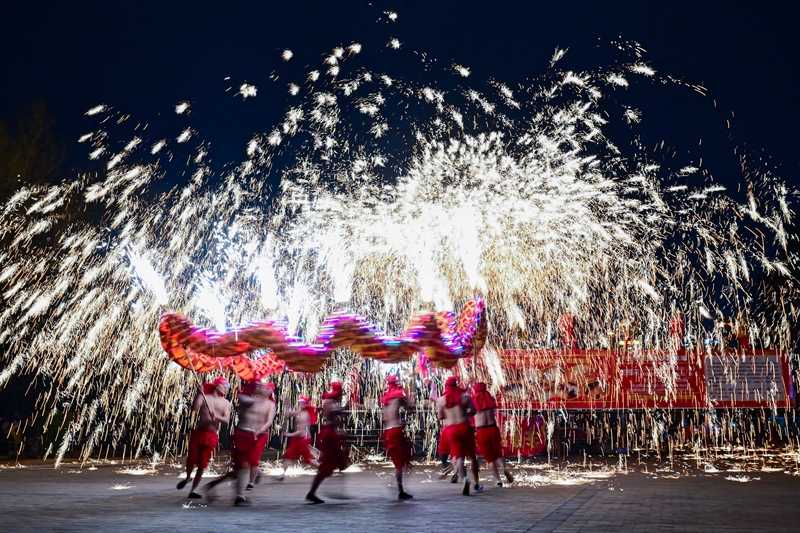 民間藝人在河南省洛陽(yáng)市2024隋唐河洛文化廟會(huì)上表演打鐵花(2024年2月14日攝)。新華社發(fā)(李衛(wèi)超 攝)