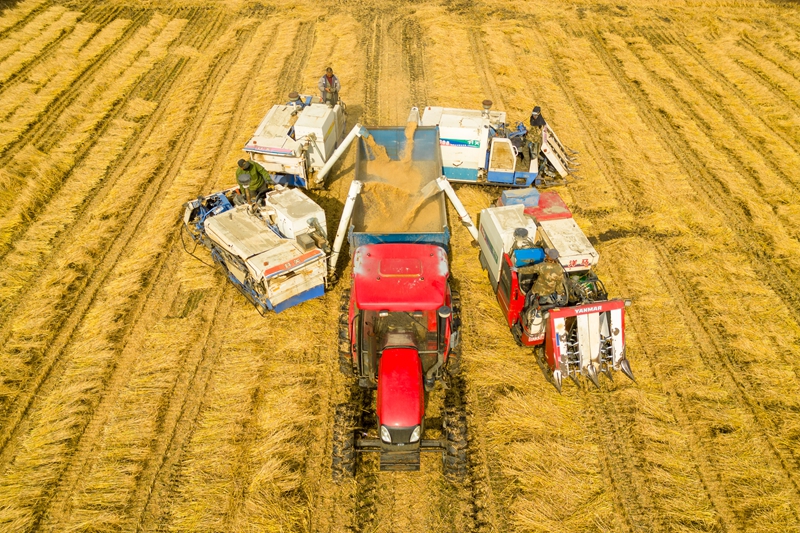 在黑龍江省綏化市北林區(qū)雙河鎮(zhèn),村民駕駛收割機(jī)進(jìn)行卸糧作業(yè)(2024年10月13日攝,無(wú)人機(jī)照片)。新華社記者 張濤 攝
