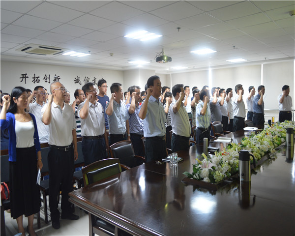 會(huì)議進(jìn)行第一項(xiàng),全體人員起立,唱國歌。嘹亮高昂的義勇軍進(jìn)行曲響徹整個(gè)會(huì)議室、整個(gè)集團(tuán)公司,歌聲振奮同志們的意志,更加堅(jiān)定了對(duì)黨的信仰。